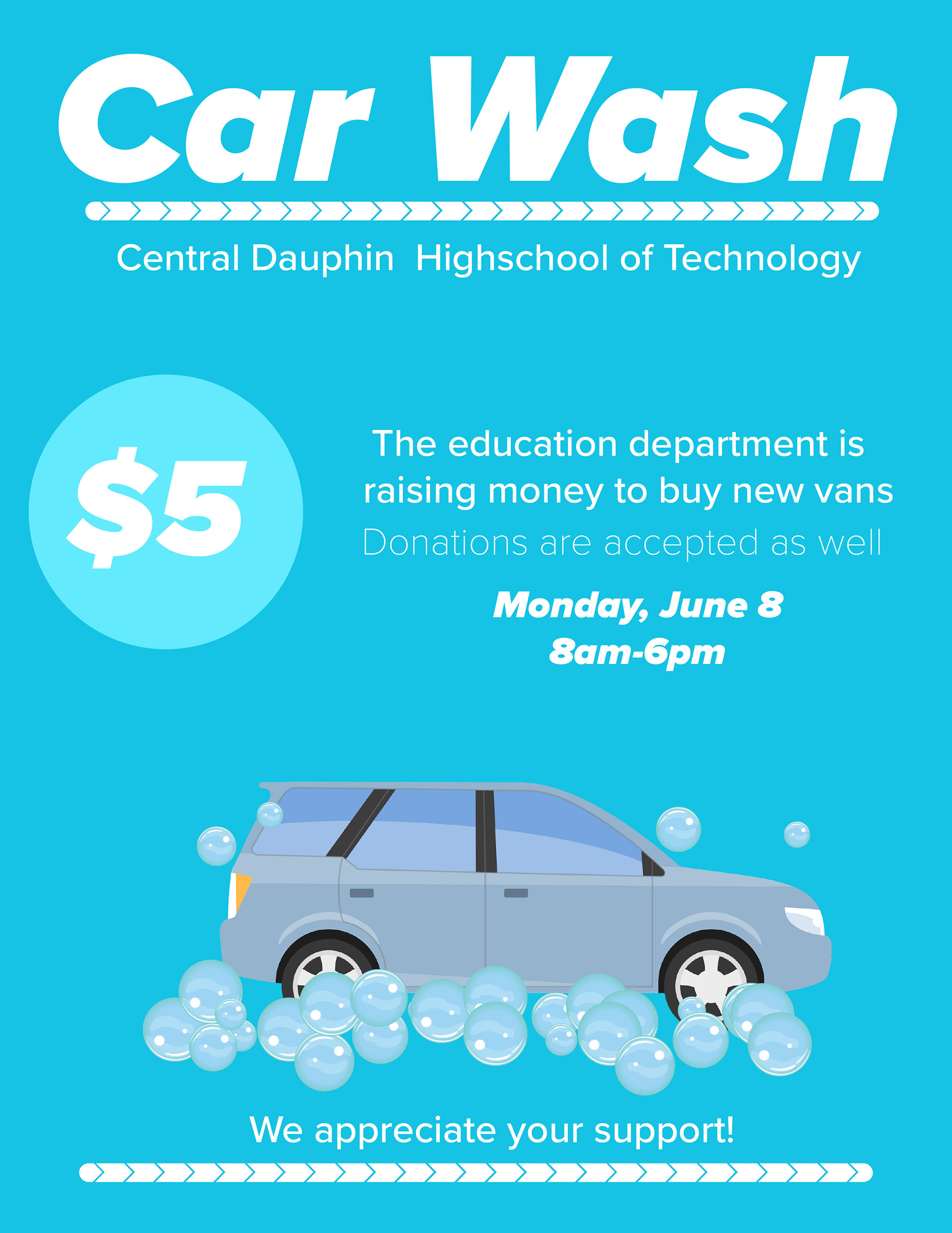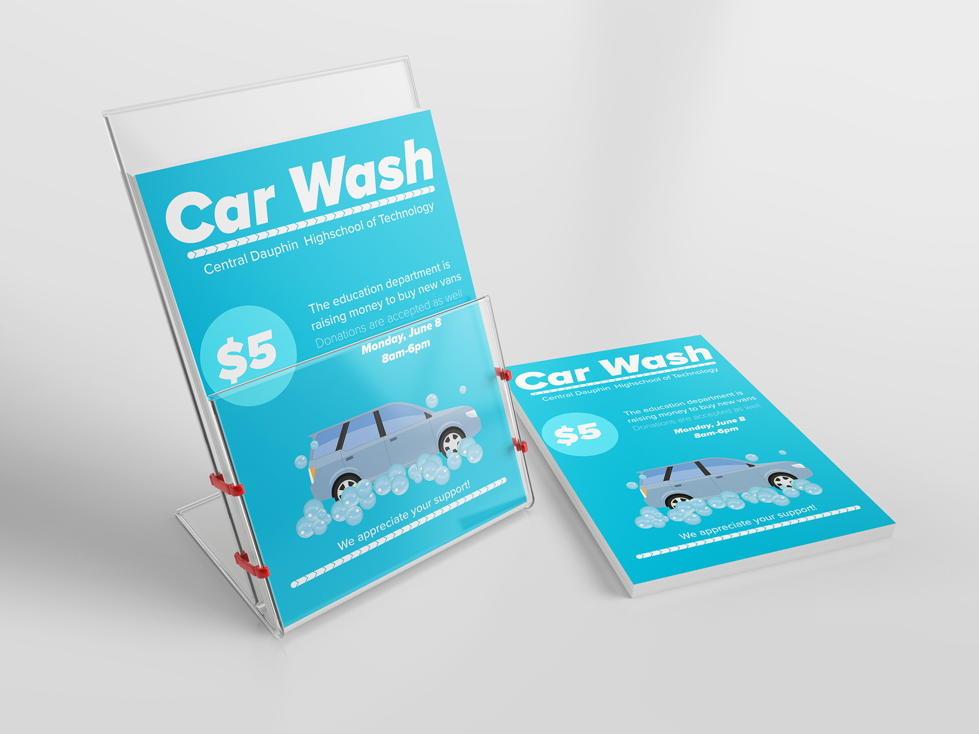This piece highlights Central Dauphin High School of Technology, which is raising funds to purchase new vans. The design features a color scheme of blue shades paired with white for contrast, creating a clean and modern aesthetic. Sans serif typography was chosen to reinforce that contemporary look. Initially, I experimented with complementary colors to emphasize certain elements, but after several iterations I refined the palette to analogous hues, resulting in a more cohesive and unified design.